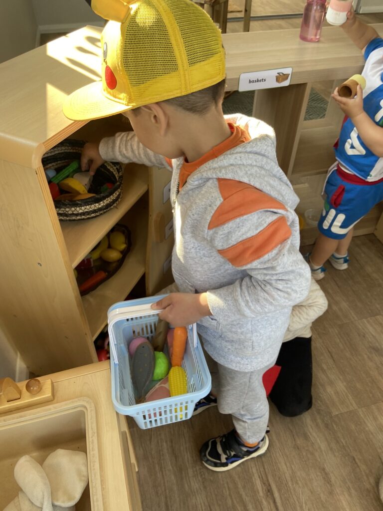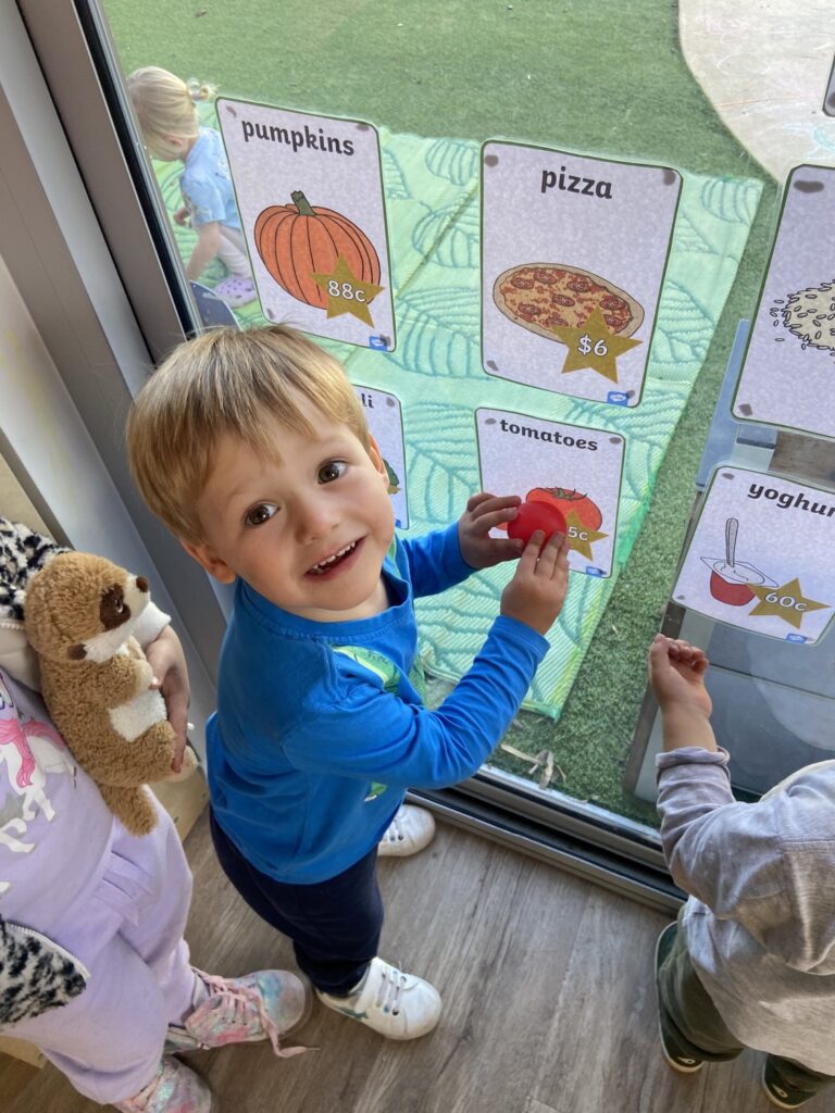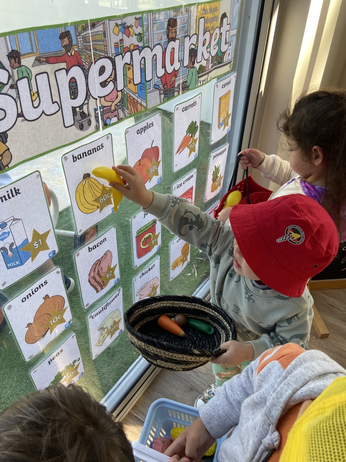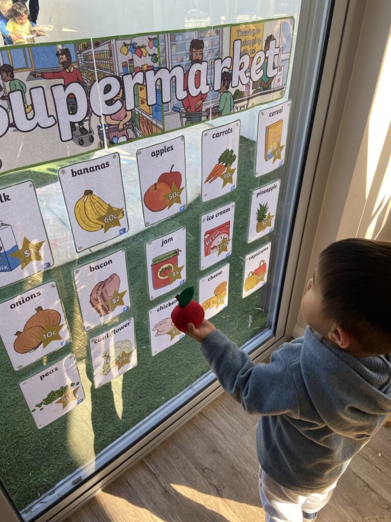 The children enjoyed shopping at our supermarket, collecting a basket to collect the various fruits, vegetables, and groceries; once collected, they matched them up against the price list on the wall.