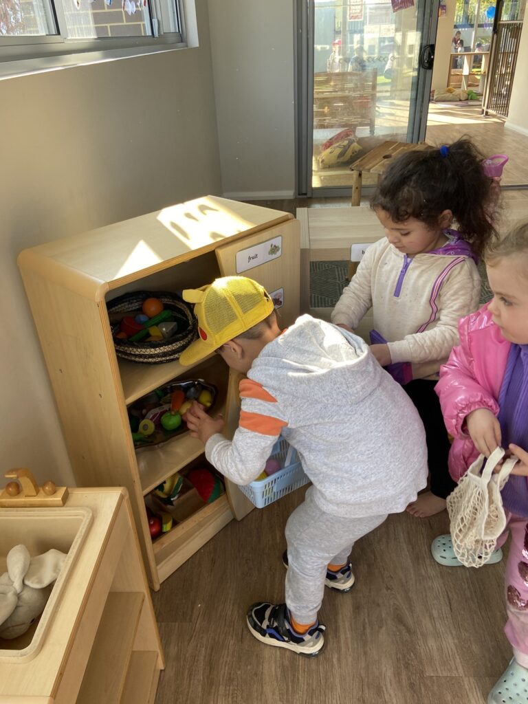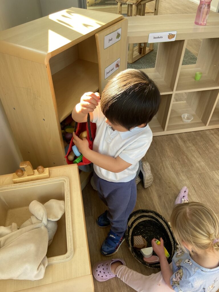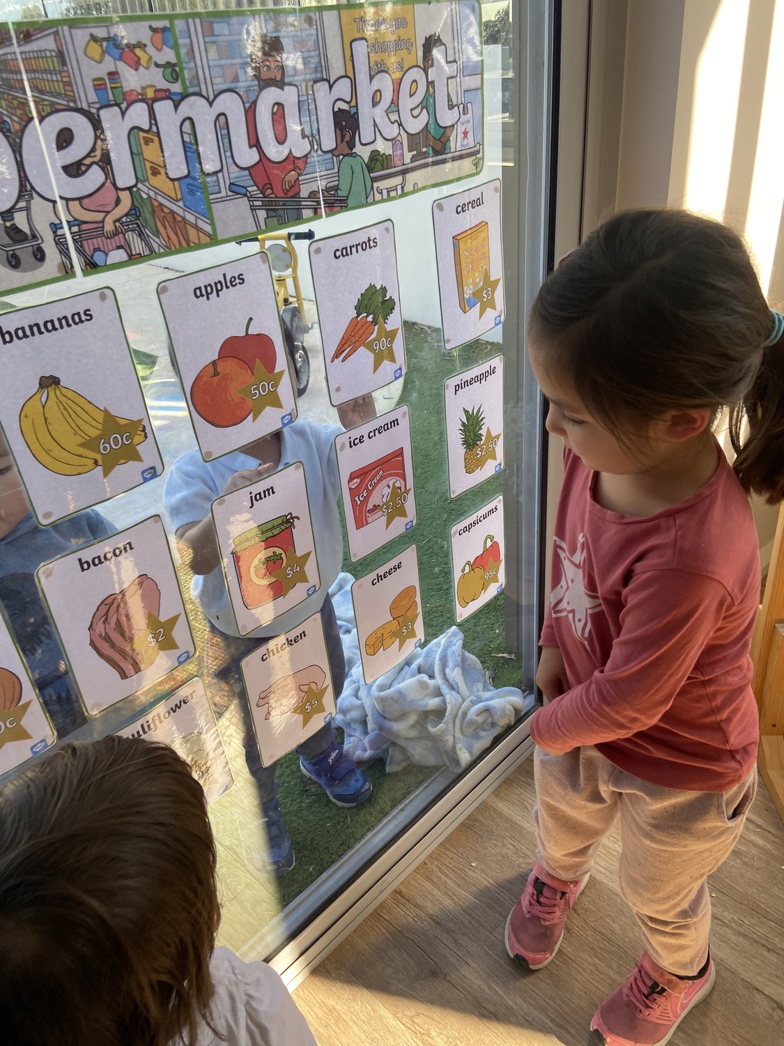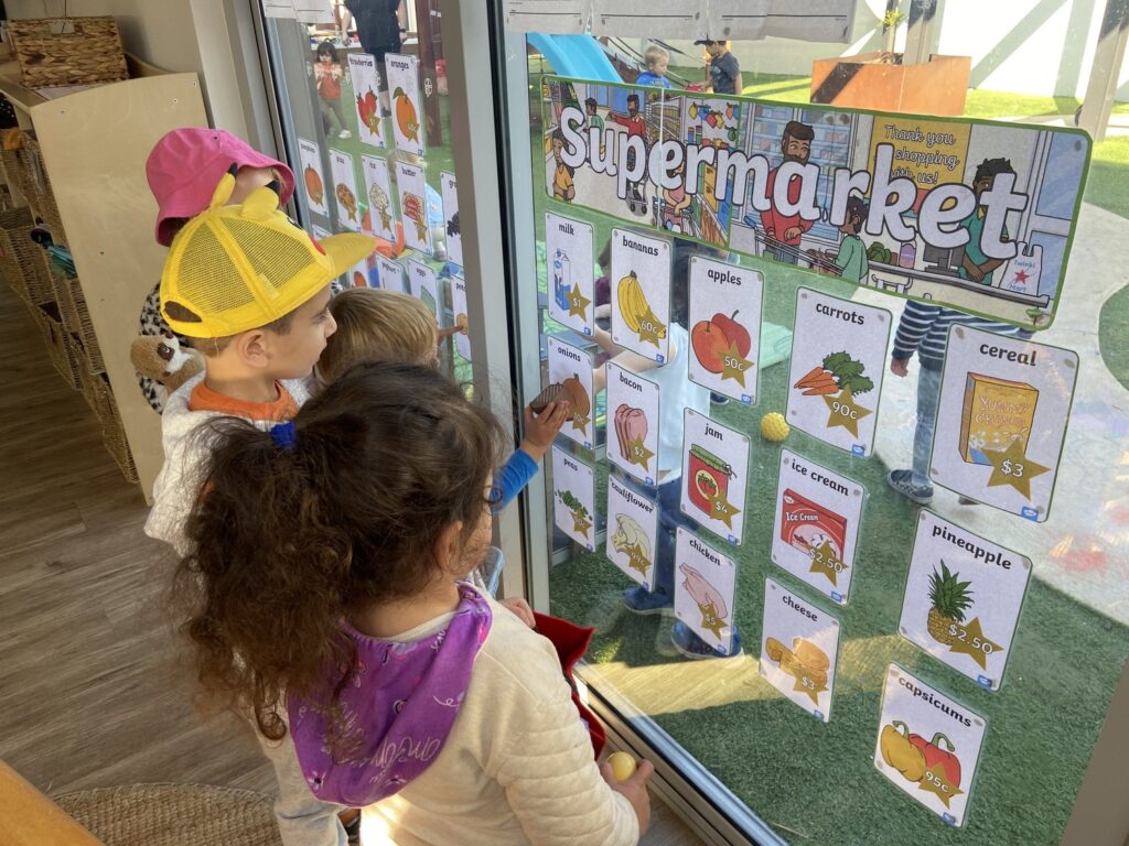 The children enjoyed shopping at our supermarket, collecting a basket to collect the various fruits, vegetables, and groceries; once collected, they matched them up against the price list on the wall.
