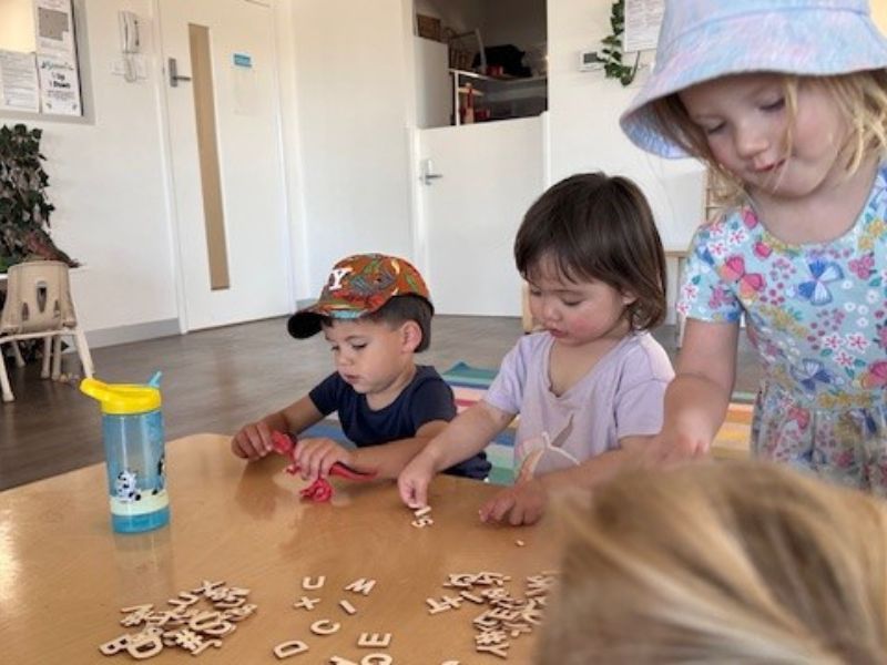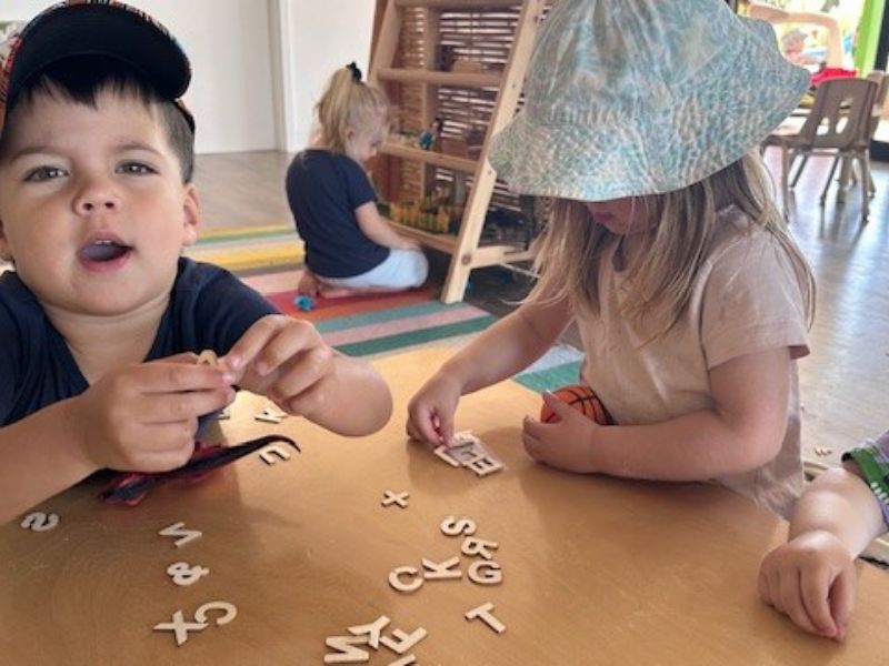 Part of our Kindy Curriculum we engage in a experience where we identify our names and then use wooden alphabet letters to match and build our names. The children helped each other to find their letters and they were singing the ABC song as they were creating their names and also other words.