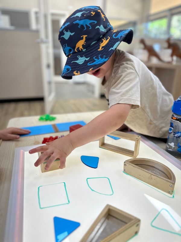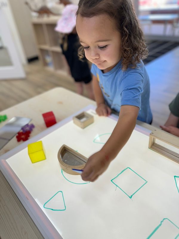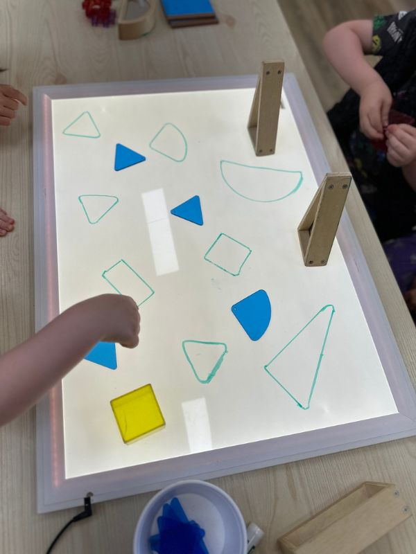 This morning in small groups, children took it in turns, engaging with the light table. We used different shapes and sized objects, drawing around them, to copy the shape, allowing children to match each shape.