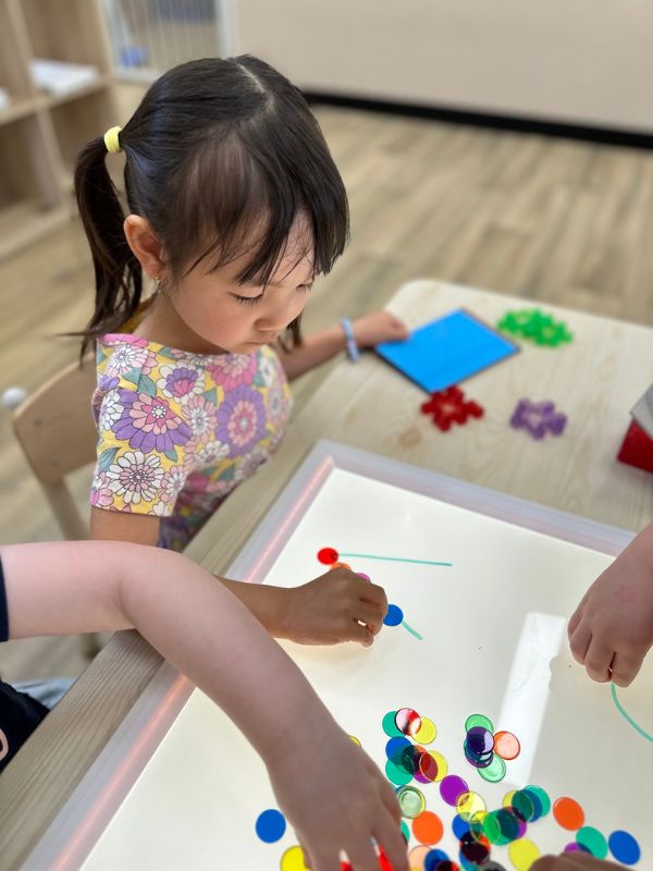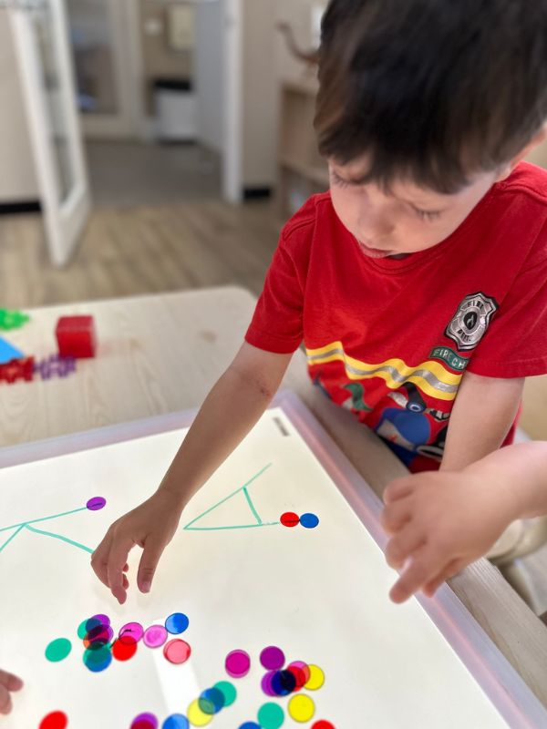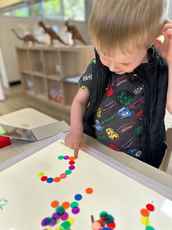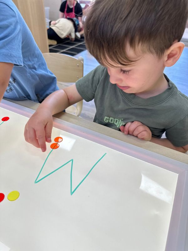 Once everyone had a turn at matching the shapes, I wrote the first letter of their name. Children used the small coloured counters, placing them on top of the letter to outline it.