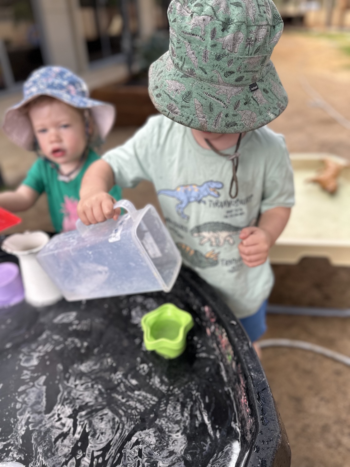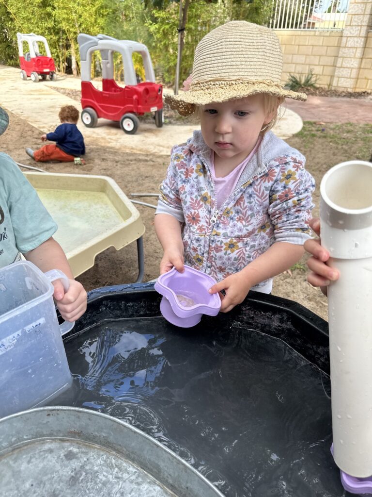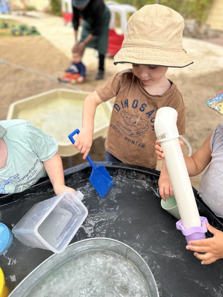 Children communicated amongst one another, asking for containers, using their imagination to create their own play whilst engaging in water play.