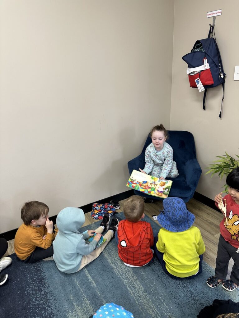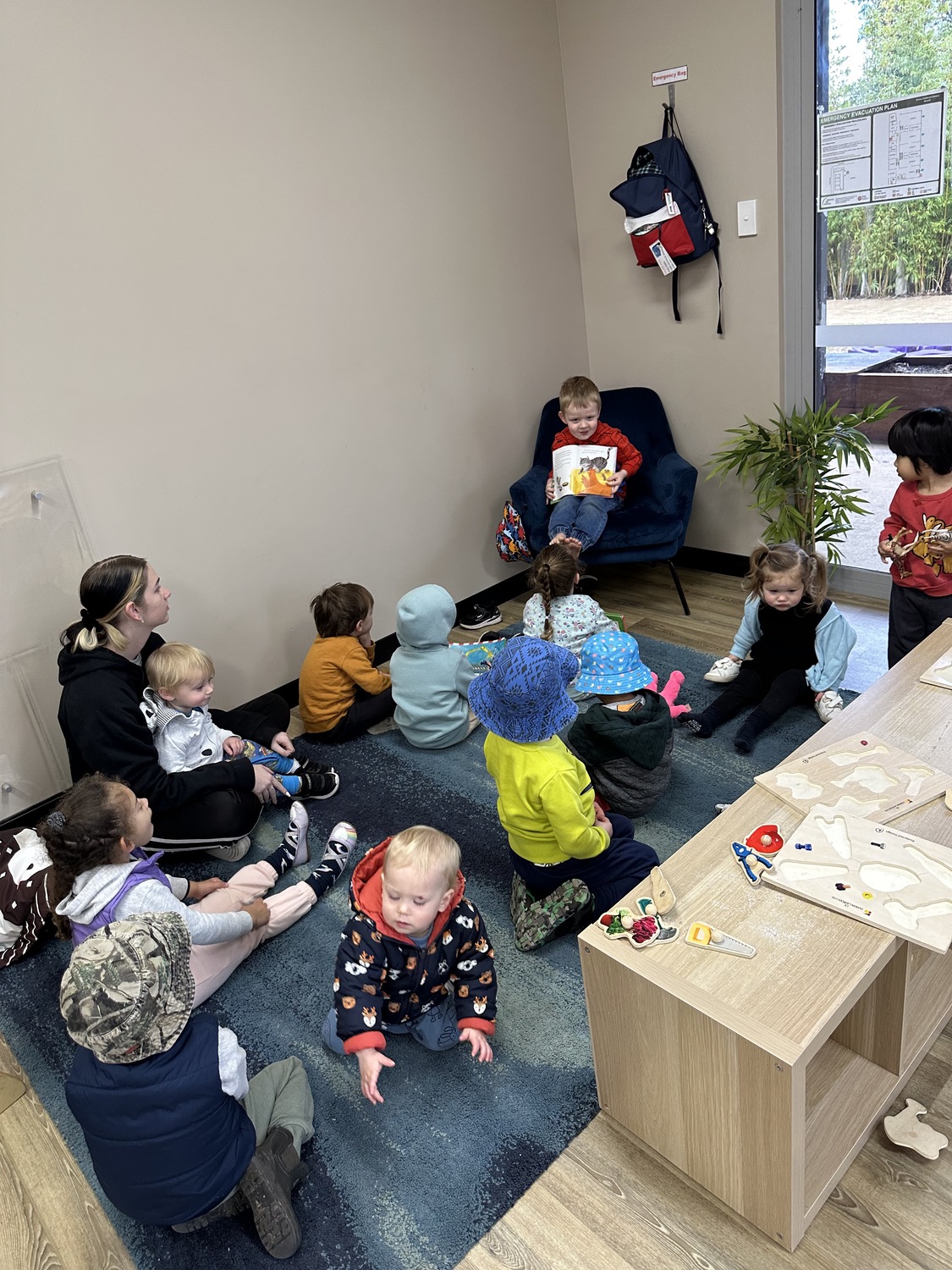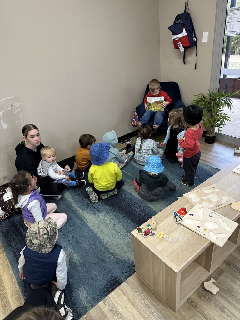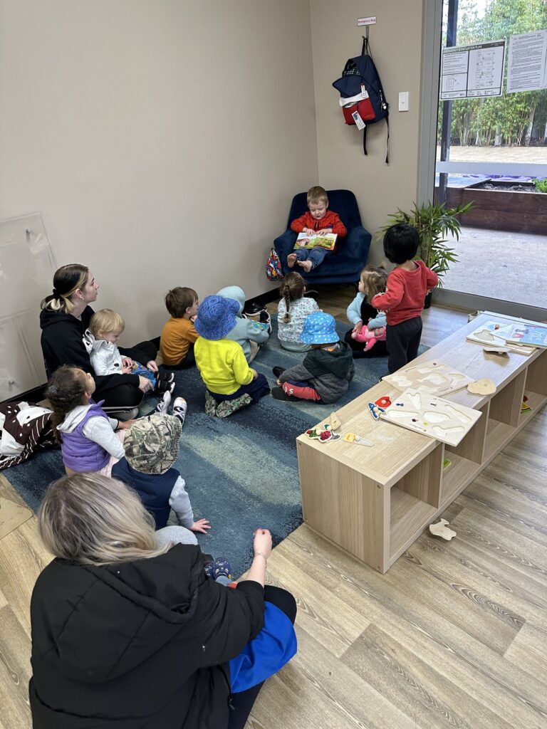 Objective: Child varies the amount of information provided to meet the demands of the situation. This morning the older children took it in turns to read their peers a story. In their own words they looked at the pictures and told a story.