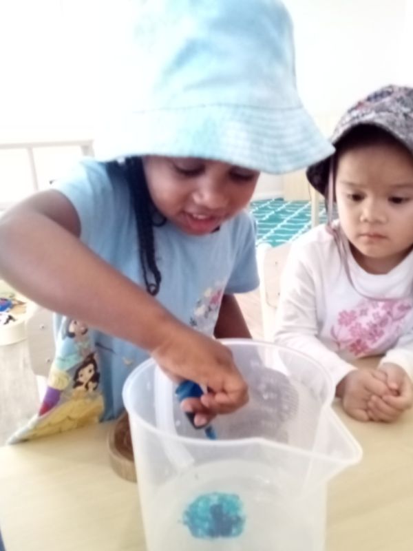This was an exciting and engaging experience, with the children seeming eager to get started. They each took turns scooping, measuring, pouring, and mixing the ingredients together in a sequence to make the play dough.