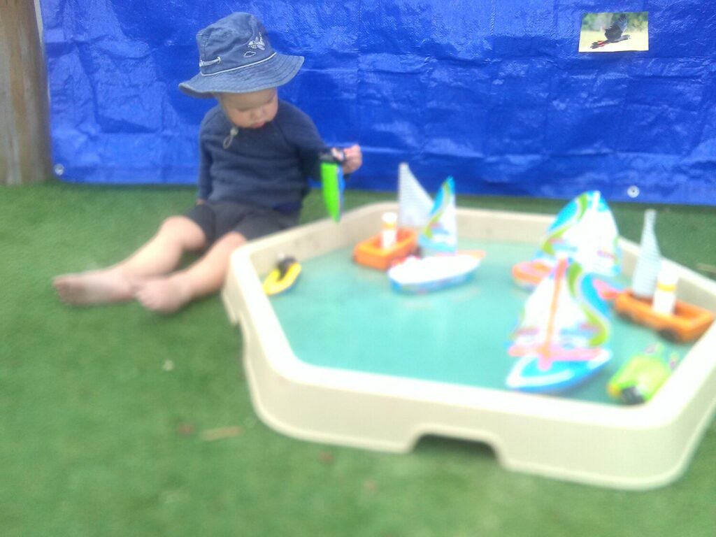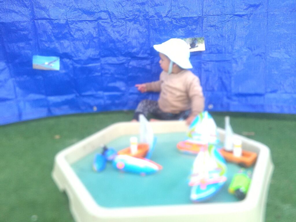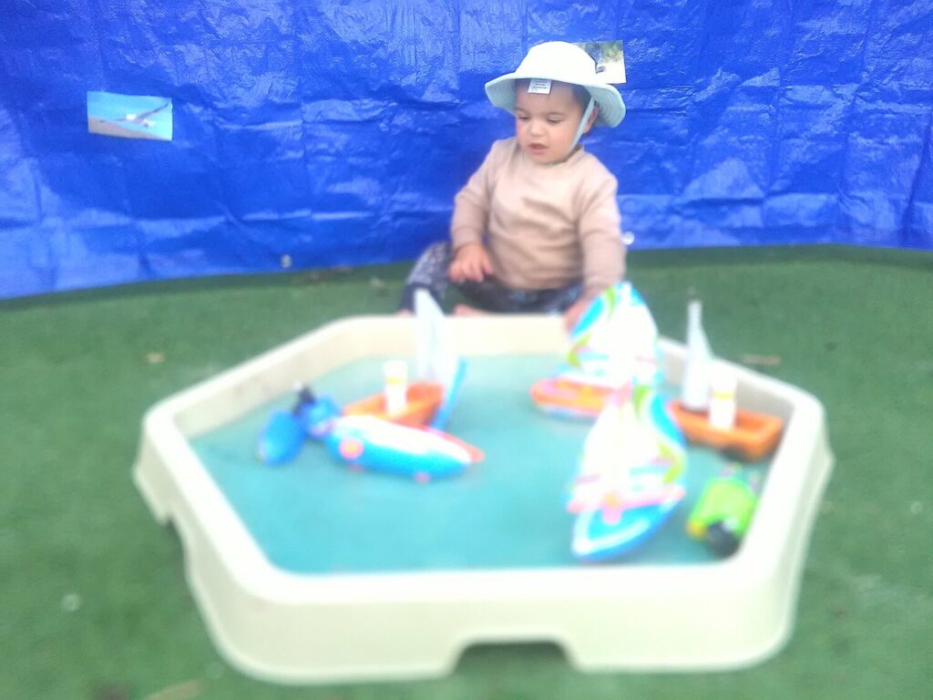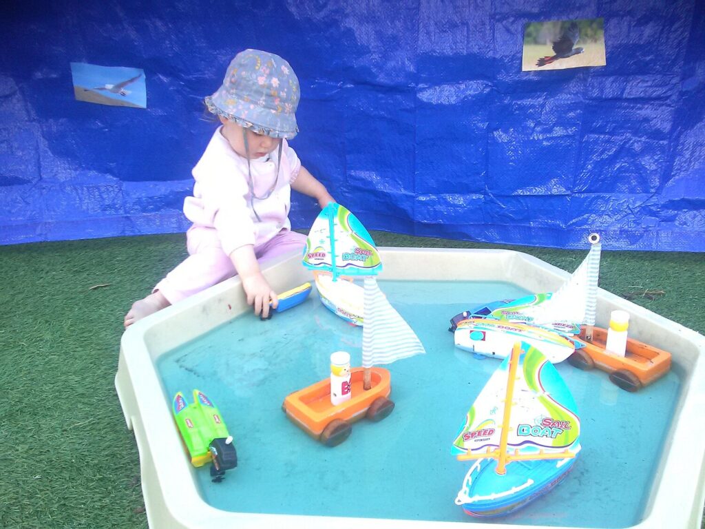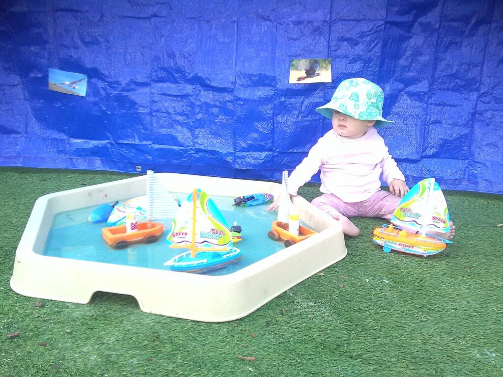 We used their interest in water play and boats to set up a fun experience. This simple experience helped to build on the children’s motor skills as they used their hands to push the boats through the water.