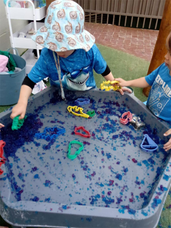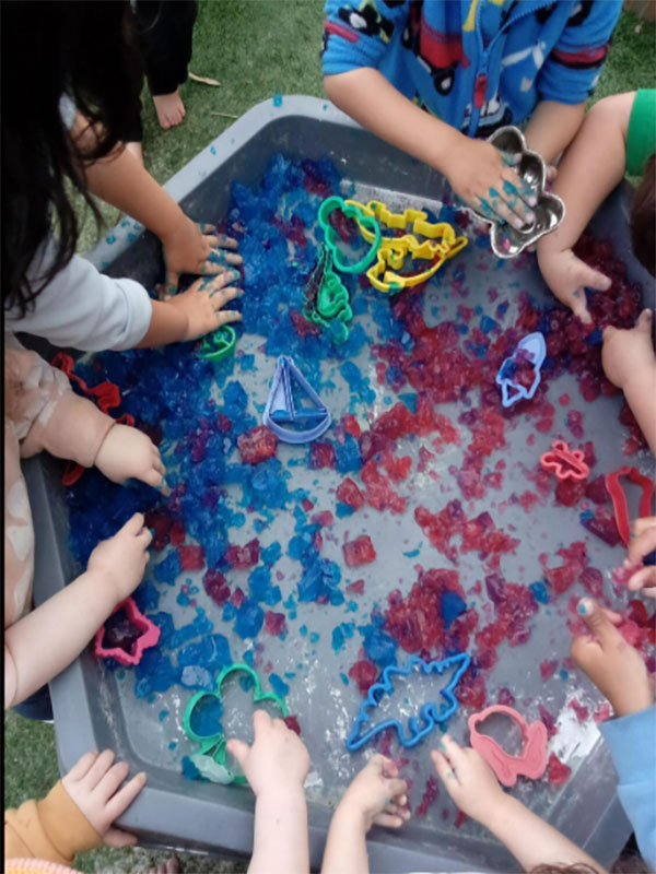 Exploring the children’s journey with sensory play, this time with jelly. The children mixed red and blue jelly together and were very excited to make the colour purple.