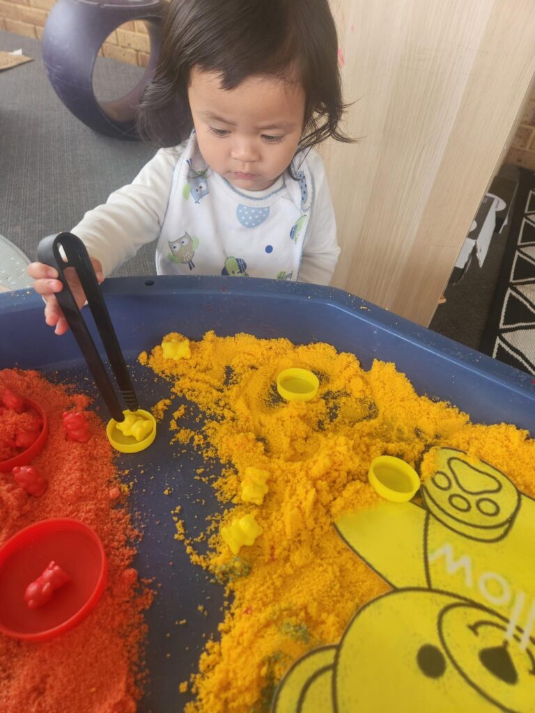 The same approach needs to be applied when teaching colours to children. It’s best to start with the primary colours (red, blue, and yellow), and once your child gets comfortable with these, move on to other colours. We then had to use tongs to pick up tiny counting bears and recycled bottle lids to colour match with the big bears and coloured salt.