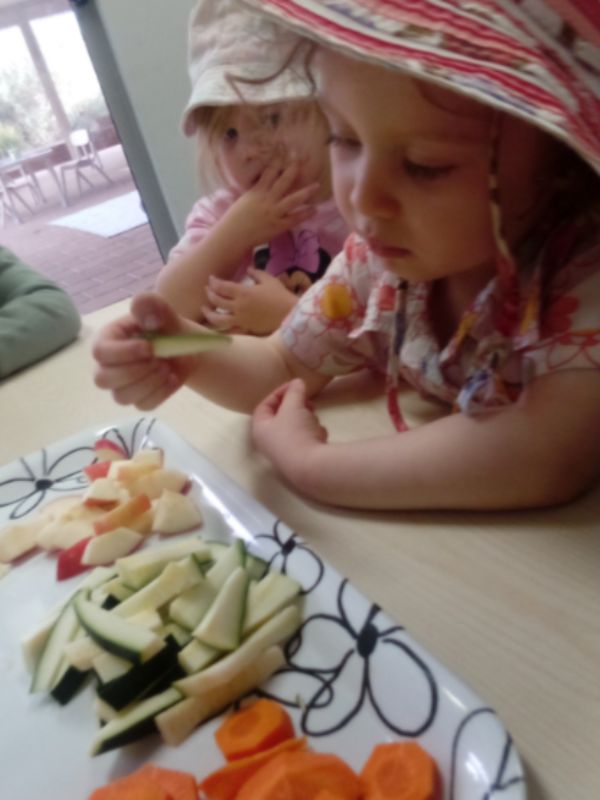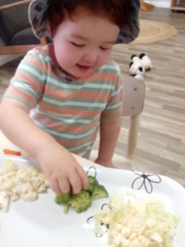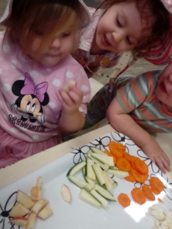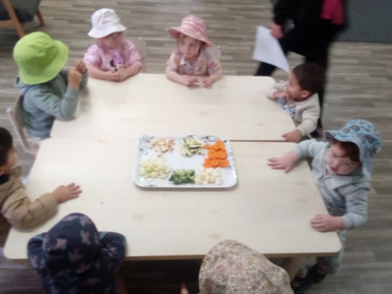 The task was to identify the vegetables and fruit, name their colour then feel their texture, and taste them. Many of the children weren’t fans of tasting the vegetables; a few liked broccoli, cauliflower, and zucchini, however, they loved the carrot and apple.