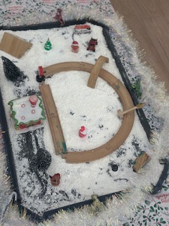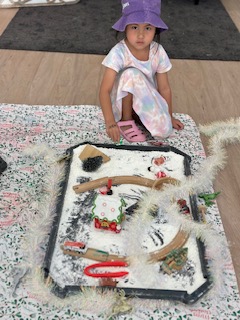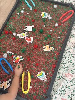 During this Christmas time, children engaged in different creative and decorative activities, including painting the Christmas tree, exploring the sensory tray with rice and snow-themed materials, and, of course play, dough as well.
