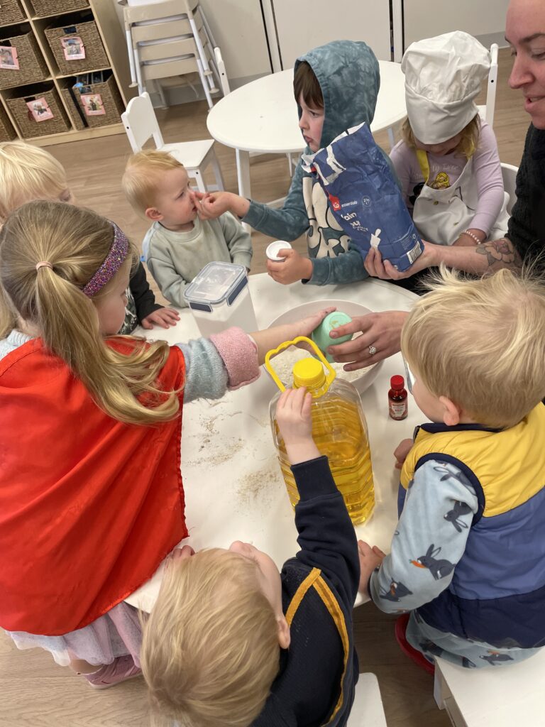 One by one the children have taken turns in measuring the ingredients, adding them in, mixing and then kneading the dough.